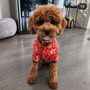 He is DNA full breed checked through Orivet and receives regular vet check ups and semen testing to ensure we offer high quality results. Charlie is well socialised, very affectionate and teddy looking toy with non shedding curly Ruby Red fur with beautiful and highly desired white markings on his chest, tummy, snout, socks and tail that features in many of his litters. Charlie is 32cms tall from front shoulder to the ground and weighs 5.6 Kgs.